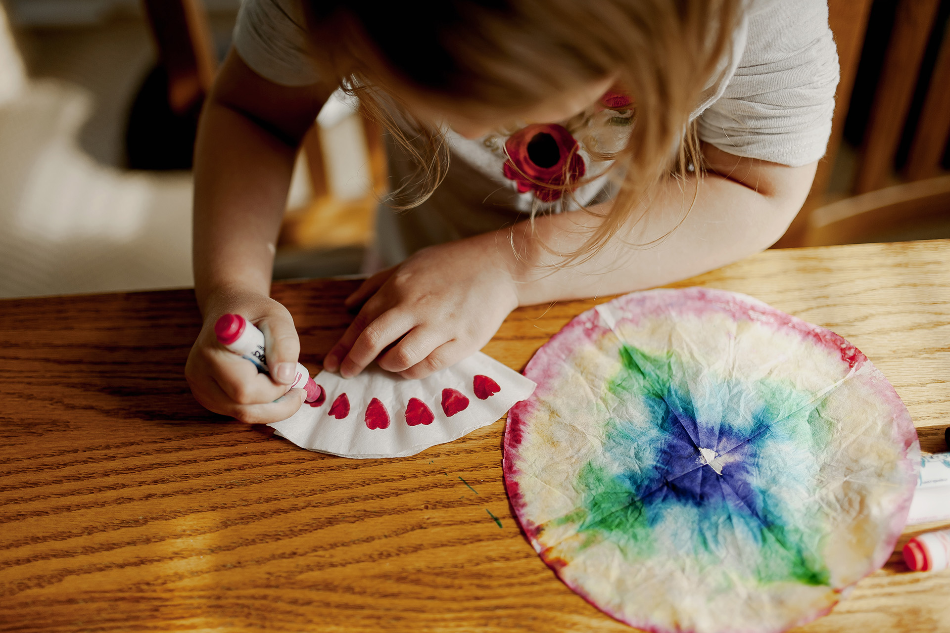 Get ready for a little colorful magic! Give your child a paper towel or coffee filter and let them draw lines, dots or patterns using washable markers. Then lightly spray or drip water onto the paper towel/coffee filter and watch as the colors spread and blend together like a rainbow. Kids will love seeing their artwork transform while exploring creativity, color mixing and cause and effect. It’s simple, a little messy and a lot of fun!